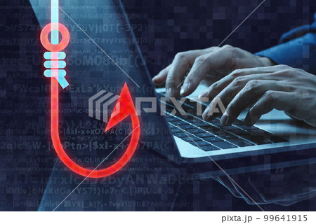 フィッシング詐欺のイメージ。釣り針のアイコンとノートパソコンを使う手のアップ。