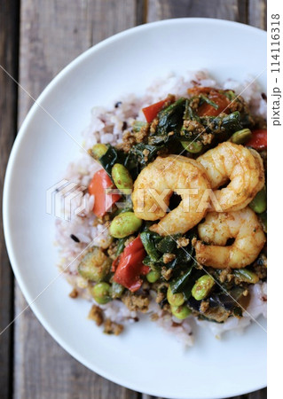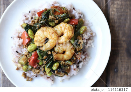 十五穀ご飯の野菜たっぷりドライカレー 海老トッピングカレー