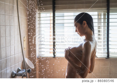 Asian naked woman having shower