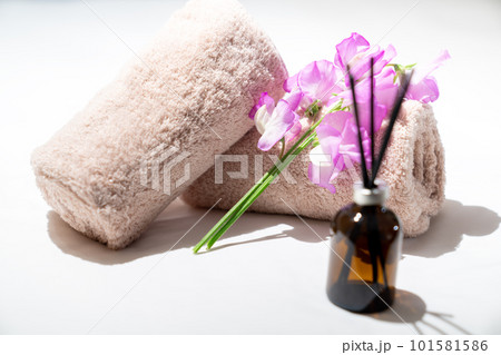Spa products for facial and body care with soft terry towels.