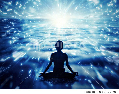 神秘的な瞑想シルエット|スピリチュアルエネルギーと宇宙の輝き|青の幻想的な背景