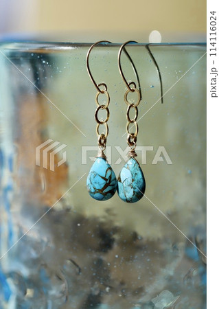 琉球ガラスに引っ掛けたコッパーターコイズのフックピアス 天然石ピアス