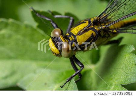Common clubtail gomphus vulgatissimus resting on green foliage during a sunny afternoon near a pond in summer