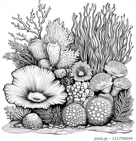 Monochrome illustration of diverse coral reef flora.