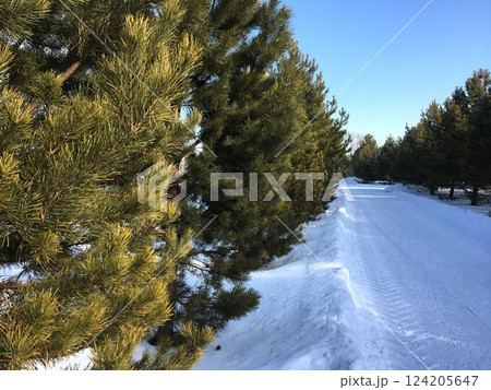 Snowy road lined with pine trees on a sunny winter day.