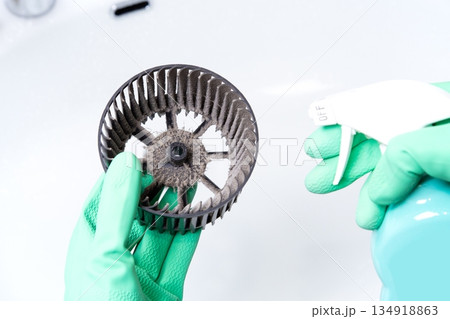 汚れた換気扇のシロッコファンを洗剤で洗浄する人の手元