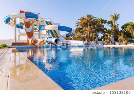 Empty small aquapark sliders with pool and palm trees at the morning, Tunisia