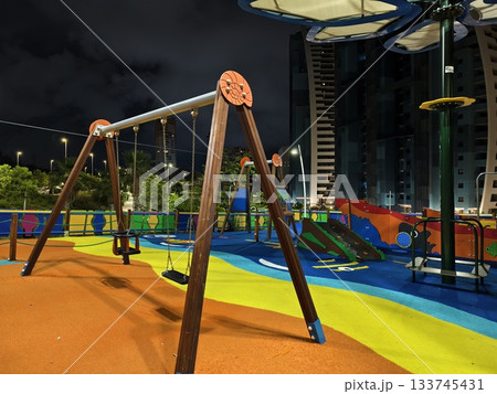 serene and deserted seafront scene featuring vacant play structures beneath luminous skyscrapers