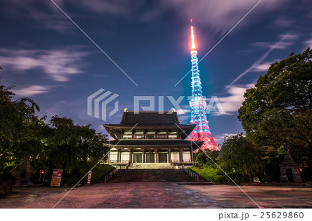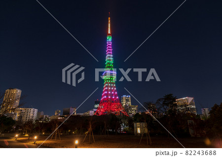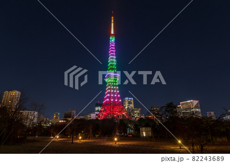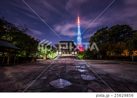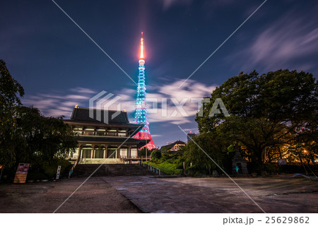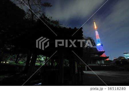 夜景「東京都」芝公園から眺めるライトアップした東京タワー