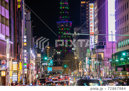 日本の東京都市景観 六本木の街。明かりの消えたビルや東京タワー、カラオケ店、タクシー=12月25日