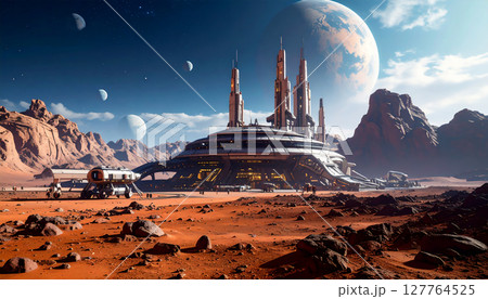 砂漠のような遠い惑星への宇宙旅行、SFの世界のスペースコロニー、生成AI画像イメージ