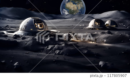 Astronaut standing in front of a lunar habitat on the moon's surface, Moon colonization themes