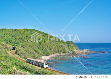 【ゆうひパーク三隅からの風景 (日本海と山陰本線)】 島根県浜田市三隅町折居