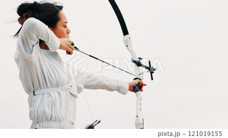 Woman, archery and aim at sky as sport for shooting practice and training as athlete in Japan. Tournament, female person and target with recurve bow or equipment for challenge, game or competition