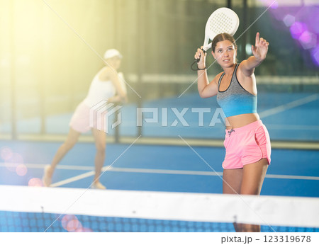Woman tennis player hands holding yellow balls on racket at summer sunset outdoor court closeup