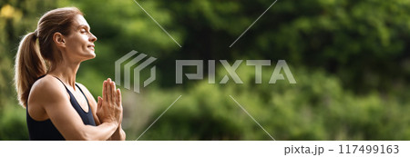 Closeup of happy millennial blonde woman in black tight sportswear meditating alone at public park, holding hands in namaste gesture, eyes closed, side view, panorama with copy space
