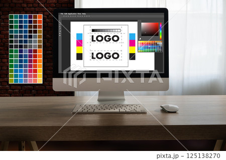 Designer workplace. pc painter tablet pencils color pallete. Vector cartoon background