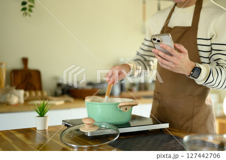 Young man stirs ingredients in a pot while referencing a recipe on his phone in a modern kitchen