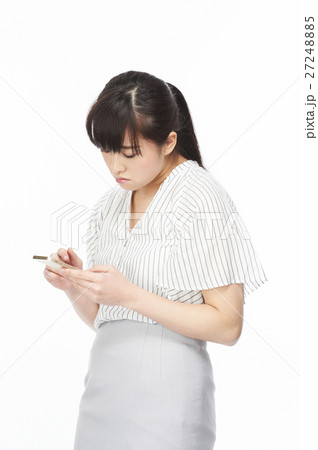 ソファーに座りうつむき加減でスマホを操作する若い女性