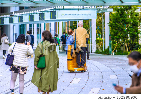 日本の東京都市景観 高輪ゲートウェイ駅前の高輪ゲートウェイシティの自動走行モビリティなどを望む