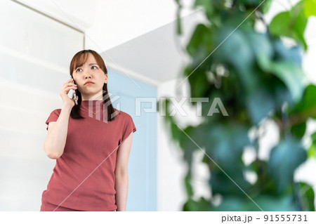 リビングで電話をする若い女性 通信障害 スモーキーピンク