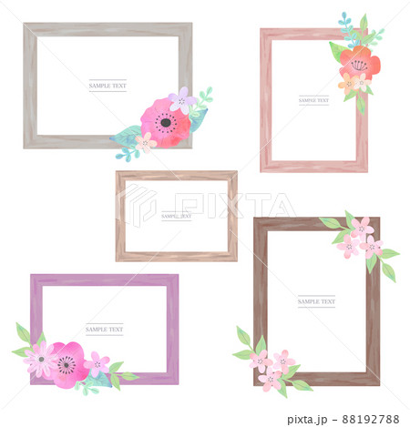 手描き花と木製フレームのイラスト素材セット(水彩風ベクター)