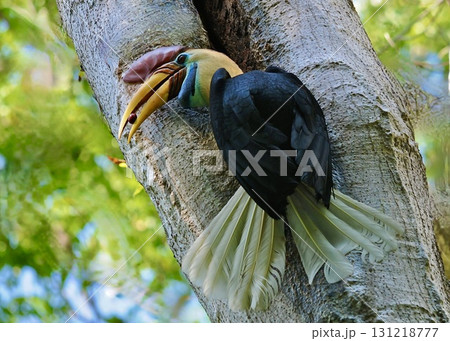 巣の中のヒナにエサを持ってきたアカコブサイチョウ。