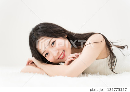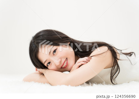 ビューティーイメージ 微笑みながら寝そべる若い女性 カメラ目線