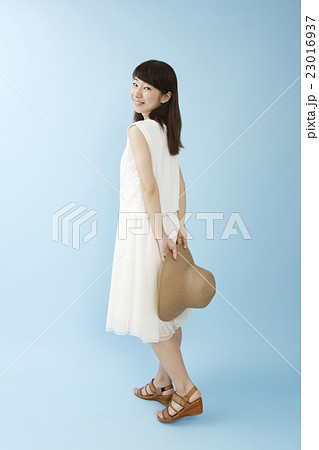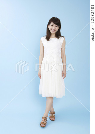 白いワンピースの女性ブルーバック