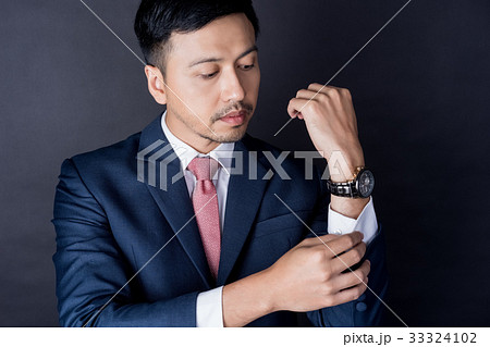 young businessman is adjusting his sleeve on black background