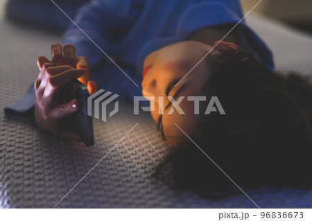 間接照明で眠りにつく女性 ベッドの睡眠や安眠のイメージ