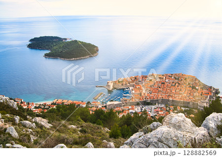 クロアチア スルジ山から見下ろしたドゥブロヴニクの旧市街の街並みとロクルム島