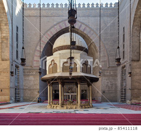Courtyard of Sultan Hasan Mosque with ablution fountain and huge arches, Cairo, Egypt