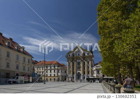 Ljubljana, Slovenia - August 15, 2019: Congress Square and the Ursulin Church of the Holy Trinity in Ljubljana