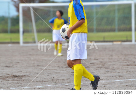 サッカーの試合中にゴールキーパーが蹴ったサッカーボール