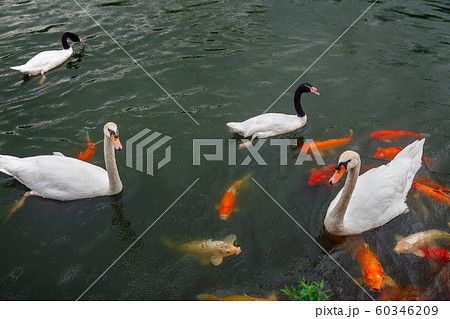 Black and white swans together. Two couples of swans swimming in a pond. Cygnus atratus and Cygnus olor.