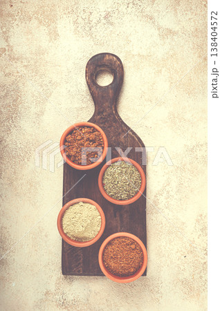 Georgian spices, in ceramic bowls, assortment, set of spices, utsho, adjika, Svan salt, ground coriander, top view, no people,
