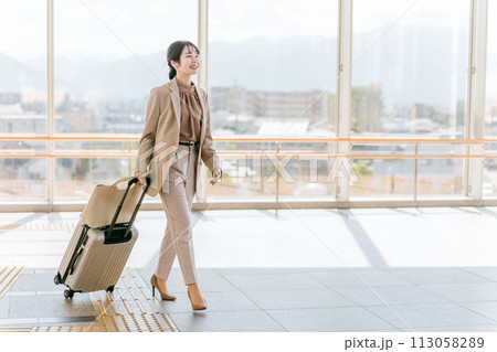空港・駅・ビル・公共交通施設でスーツケースを持って歩くビジネスウーマン(海外出張・徒歩)