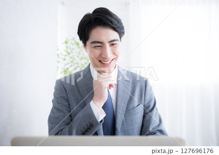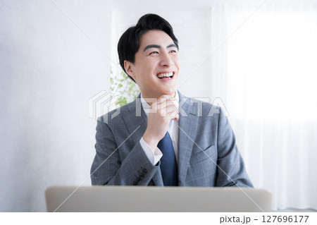 デスクで座るパソコンを使うビジネスマン 考えるポシティブな顎を手に当てるポーズ