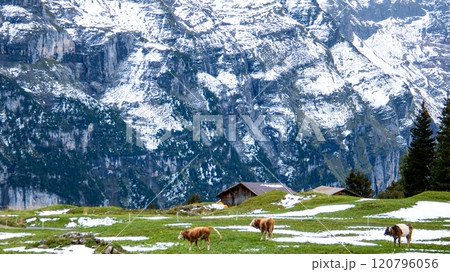 アンメルトフーベルのトレッキングの風景 牛 ミューレン ラウターブルンネン スイス
