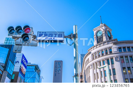日本の東京都市景観9月24日。東京・銀座。セイコーハウス銀座などを望む