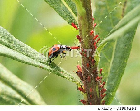 セイタカアワダチソウヒゲナガアブラムシを捕食しているナナホシテントウ