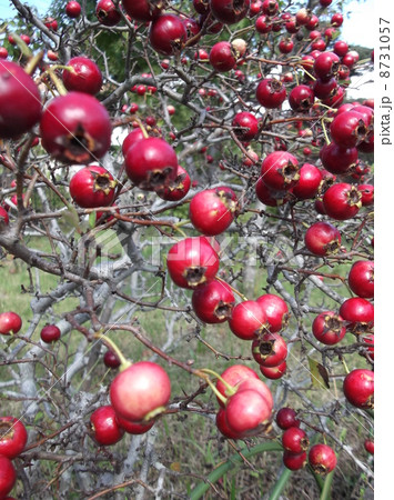 赤く熟れたサンザシの実 薬用効果のあるサンザシの実はハーブ
