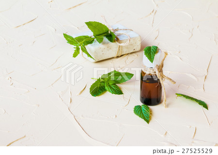 Bottle of mint essential oil and peppermint leaves. Mortar of spearmint leaves and blossom Mentha piperita medinal plants on background.