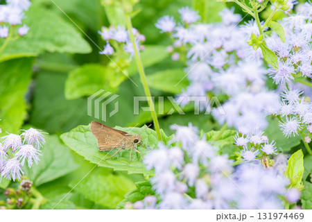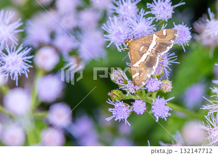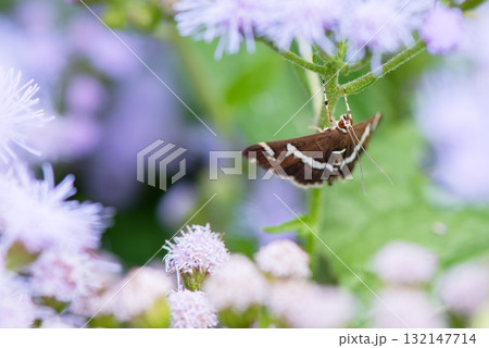 薄紫色のユーパトリウムにとまるノメイガのいる風景