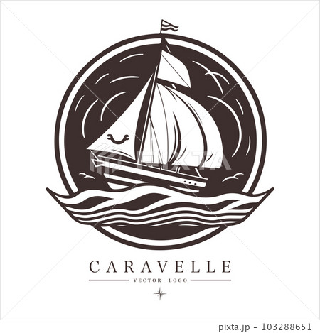 Caravelle on the water Logo vintage emblem. Old retro vector illustration marine navy icon.