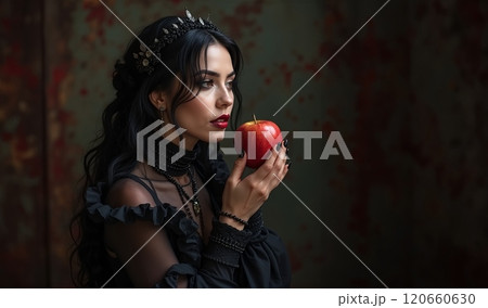 A captivating gothic portrait of a woman holding a red apple, exuding mystery and allure that draws you in