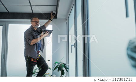 Male technician stands on ladder, installs CCTV camera in office room using tablet
