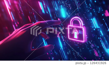 hand reaches towards glowing digital padlock symbol, representing security and technology. vibrant colors create futuristic atmosphere