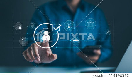 Interactive KYC compliance interface with the user. Business professional interacting with a Know Your Customer (KYC) compliance and security interface on digital screen. Identity verification, E KYC,